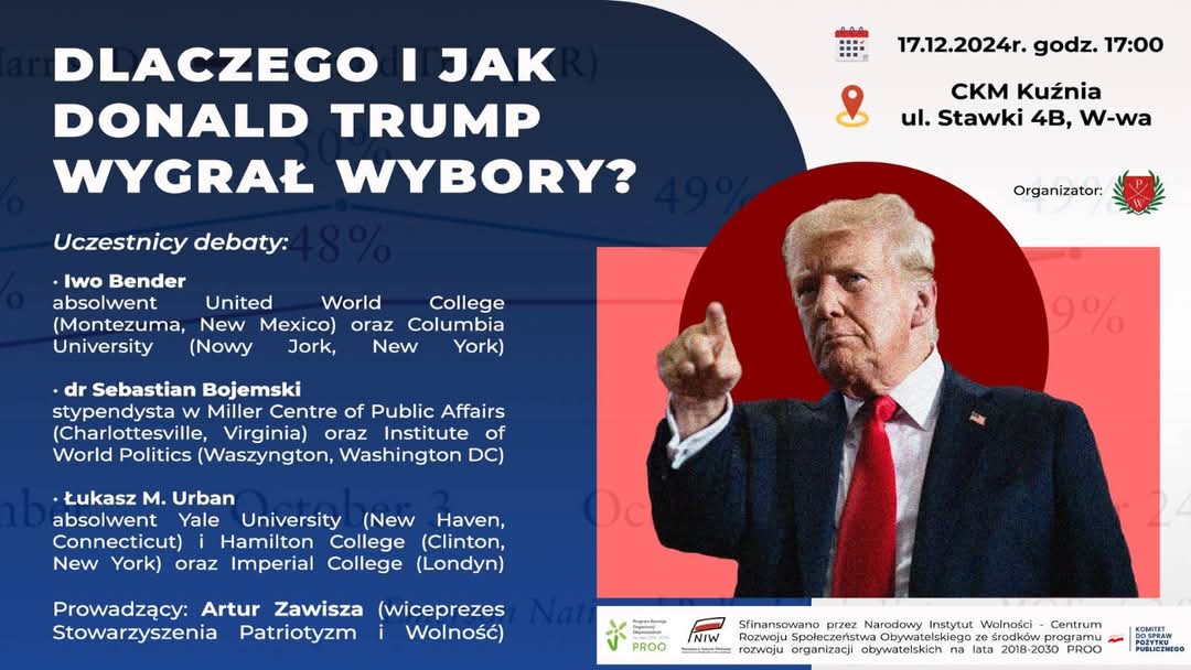 W dniu 17 grudnia 2024 r. o godz. 17:00 w Centrum Kultury Młodych „Kuźnia" przy ul. Stawki 4B w Warszawie odbyła się debata pt. „Dlaczego i jak Donald Trump wygrał wybory?".