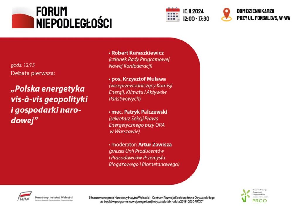 W dniu 10 listopada 2024 r. w Domu Dziennikarza przy ul. Foksal 3/5 w Warszawie odbyło się Forum Niepodległości, podczas którego o godz. 12:15 rozpoczęła się pierwsza debata pt. „Polska energetyka vis-à-vis geopolityki i gospodarki narodowej”.